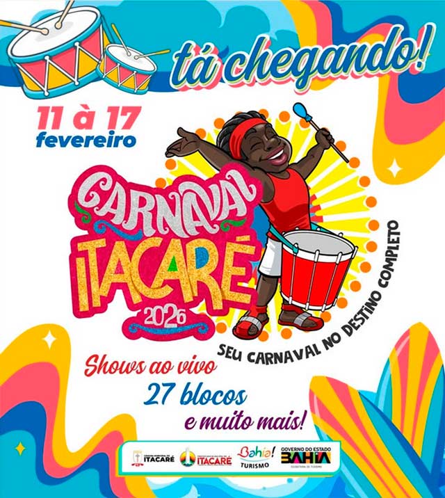 De 11 a 17 de fevereiro, Itacaré é o palco de muita alegria, cultura e tradição, com uma programação que reúne 27 blocos carnavalescos, além de shows ao vivo na orla, garantindo diversão para moradores e visitantes. E a festa começa antes: dia 08/02, acontece o tradicional Grito dos Caretas, abrindo oficialmente o clima de Carnaval na cidade. Em breve a programação completa.