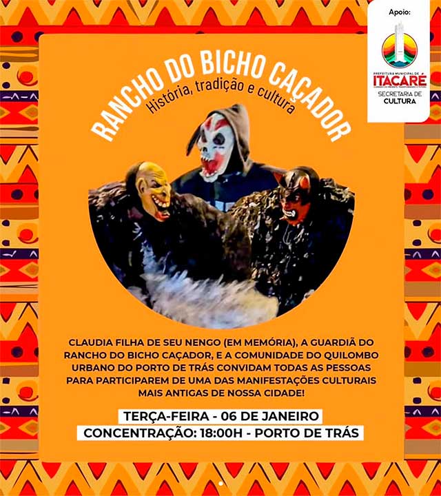Claudia, filha de Seu Nengo (em memória), a guardiã do Rancho do Bicho Caçador, e a comunidade do Quilombo Urbano do Porto de Trás convidam todas as pessoas para participarem de uma das manifestações culturais mais antigas da cidade de Itacaré: Terça-feira, 06/01, concentração a partir das 18h no Porto de Trás.
