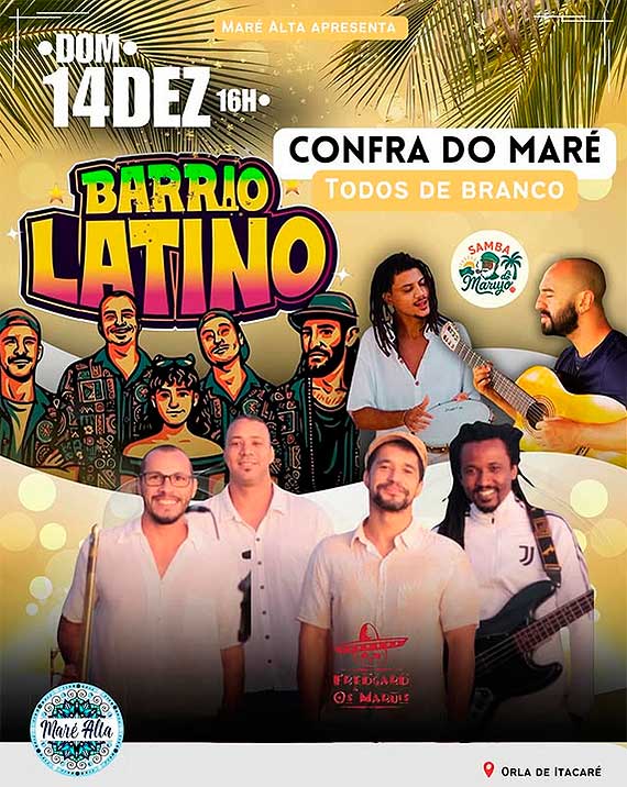 Domingo, dia 14 de dezembro, você tem um encontro na Confra do Maré, e já sabem a única regra: todos de branco! É para reunir os amigos, dar risada, dançar, comemorar o ano de 2025 e festejar 2026 que tá logo ali! Cheguem cedo pois a programação começa às 16h, então adianta aquela praia de domingo, volta cedinho e vai curtir o fim de tarde com esse line-up que tá incrível!