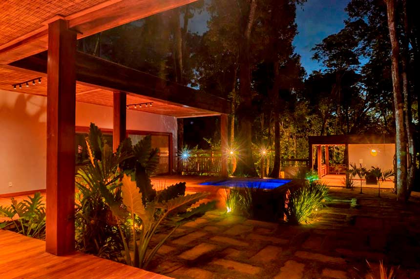 Agora olha isso… uma jacuzzi maravilhosa, revestida em madeira, no meio desse paraíso. Já imaginou relaxar aqui depois de um dia de praia?