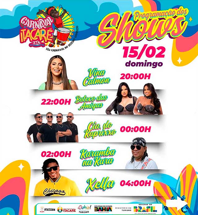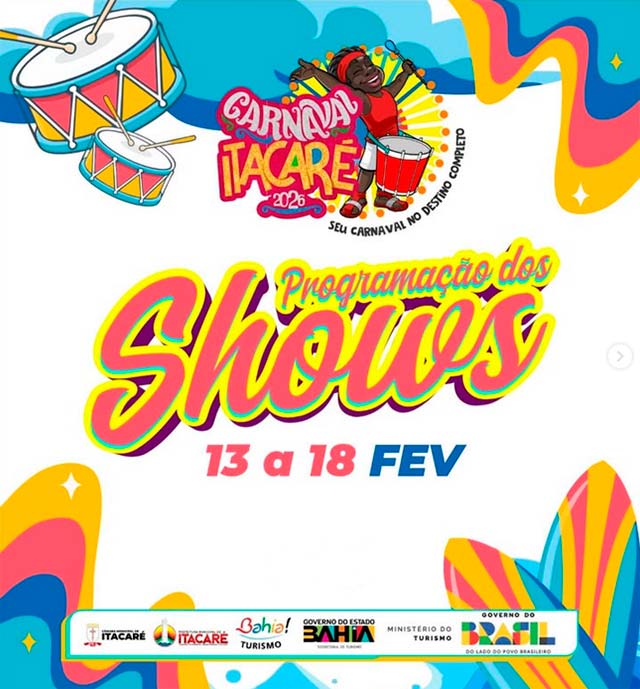 De 11 a 18/02 Itacaré é palco de muita alegria, cultura e tradição, com uma programação que reúne blocos, além de shows ao vivo na orla, garantindo diversão para todos. Atrações como Adão Negro, Lipe Gama, Patrulha do Samba, Larissa Gomes, Alex Maxx, Xella, Guga Meyra, Malafaia, Boteco das Amigas, Simone Morena, Netto Brito, Toque Dez, Cia do Kaprixxo, Vina Calmon e muito mais são esperadas!