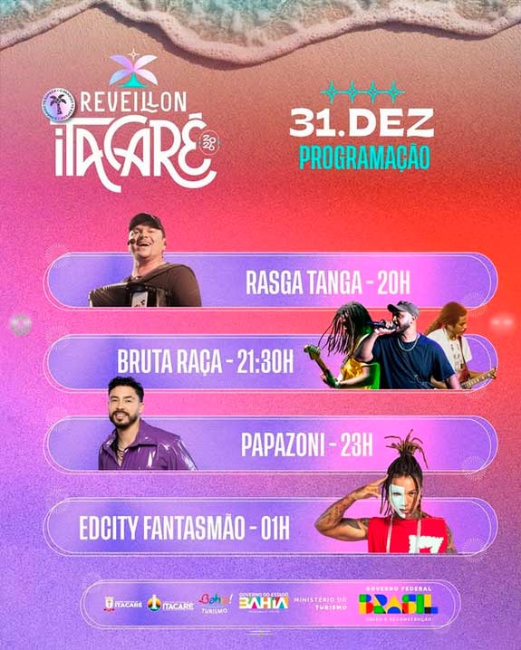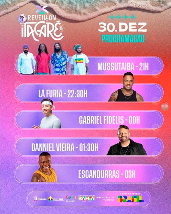 O Réveillon de Itacaré na Praia da Coroinha já é tradição, e este ano reflete o que por aqui há de melhor: alegria, acolhimento e a vibe única da Orla. Dias 30 e 31/12 seu encontro é aqui, celebrando a vida e as novas oportunidades que chegam com o novo ano. O paraíso te espera de braços abertos! Fantasmão, Escandurras, La Fúria, Papazoni, Gabriel Fidelis, Danniel Vieira, Mussutaíba e Bruta Raça.