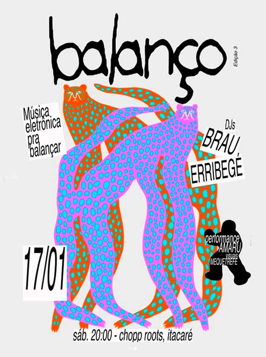 A Festa Balanço volta a ocupar a pista com mais uma edição quente e cheia de movimento. Uma noite de música eletrônica feita pra dançar, suar e se deixar levar pelo ritmo. No comando da noite, os DJs Brau e Erribegé criando a experiência que se completa com performance de Amaru e visuais de Mequetrefe. Som, corpo e arte num só fluxo.