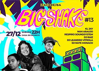 A Big Shake chega com força total para sua 13ª edição, encerrando o ano na vibração do litoral sul da Bahia - Itacaré! Dessa vez, o evento vai acontecer na histórica Casa do Boneco, espaço de resistência e cultura afro-baiana, para uma noite que promete atravessar ritmos, celebrar identidades e botar a pista pra ferver até altas horas.Casa do Boneco - 22h - Ladeira da Concha