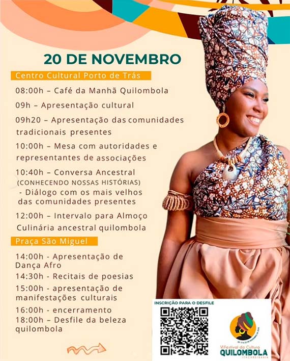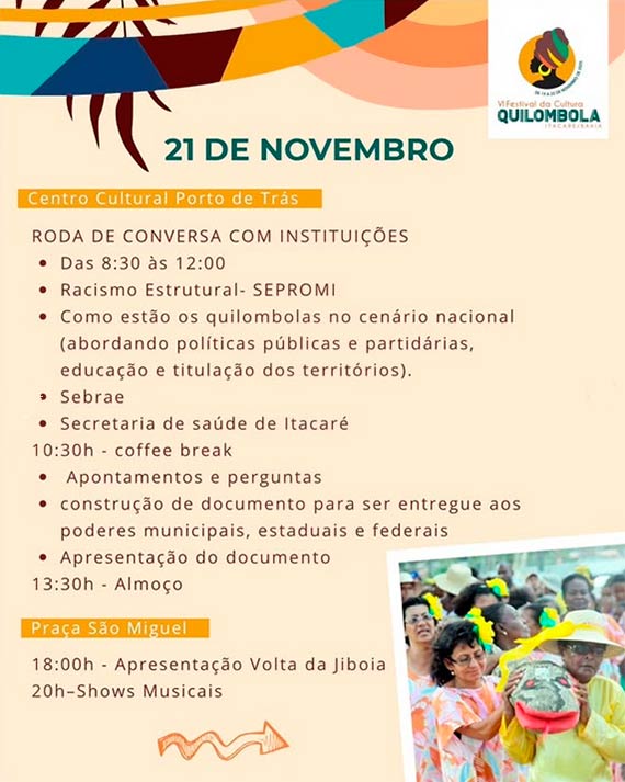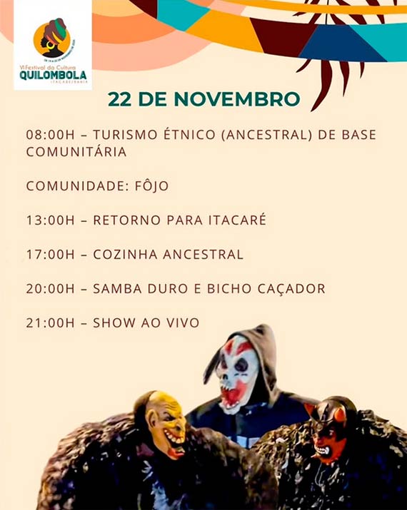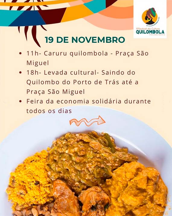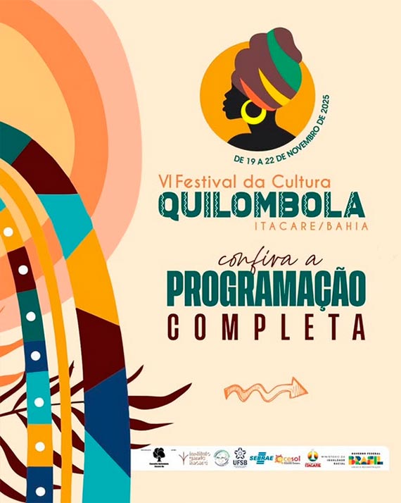 Se programe para o melhor Festival de Cultura Quilombola de Itacaré! Acontece de 19 a 22 de novembro, e você tem um encontro marcado com as tradições, sabores e muita alegria. Caruru, apresentações culturais, shows ao vivo, desfile da beleza quilombola, cozinha ancestral, visita ao quilombo do Fôjo e muito mais! Veja a programação e não perca nenhum momento dessa grande celebração cultural.